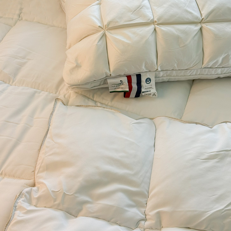 - مخدتين ريش نعام فرنسي أصلي: نعومة فائقة ودفء متوازن يهدئ الرأس والعنق بأسلوب ملكي، لنوم يشبه الحلم الفاخر.